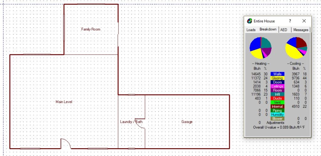 This is an example of a load calculation using Wrightsoft. The load meter on the right shows what elements of of the building are contributing to both the heating needs and cooling needs in a home that is pretty well insulated.